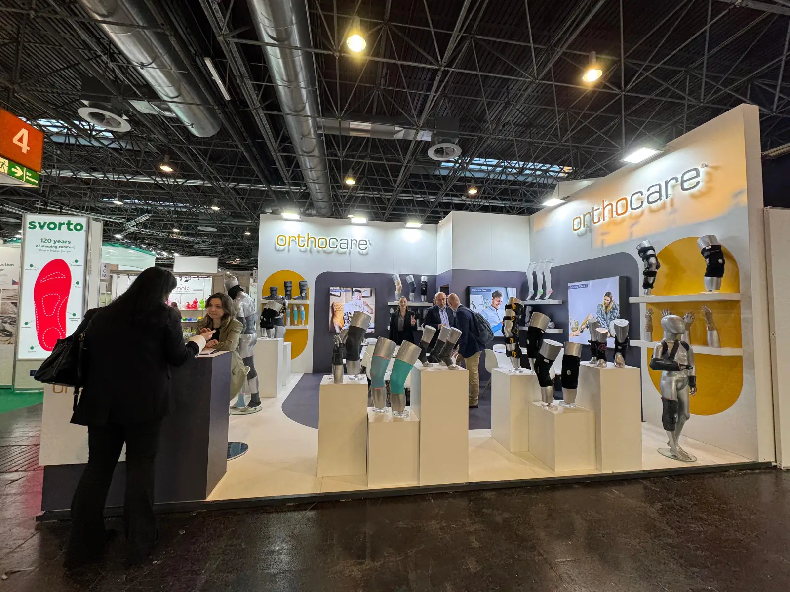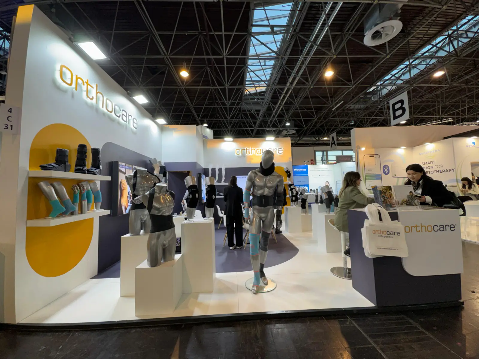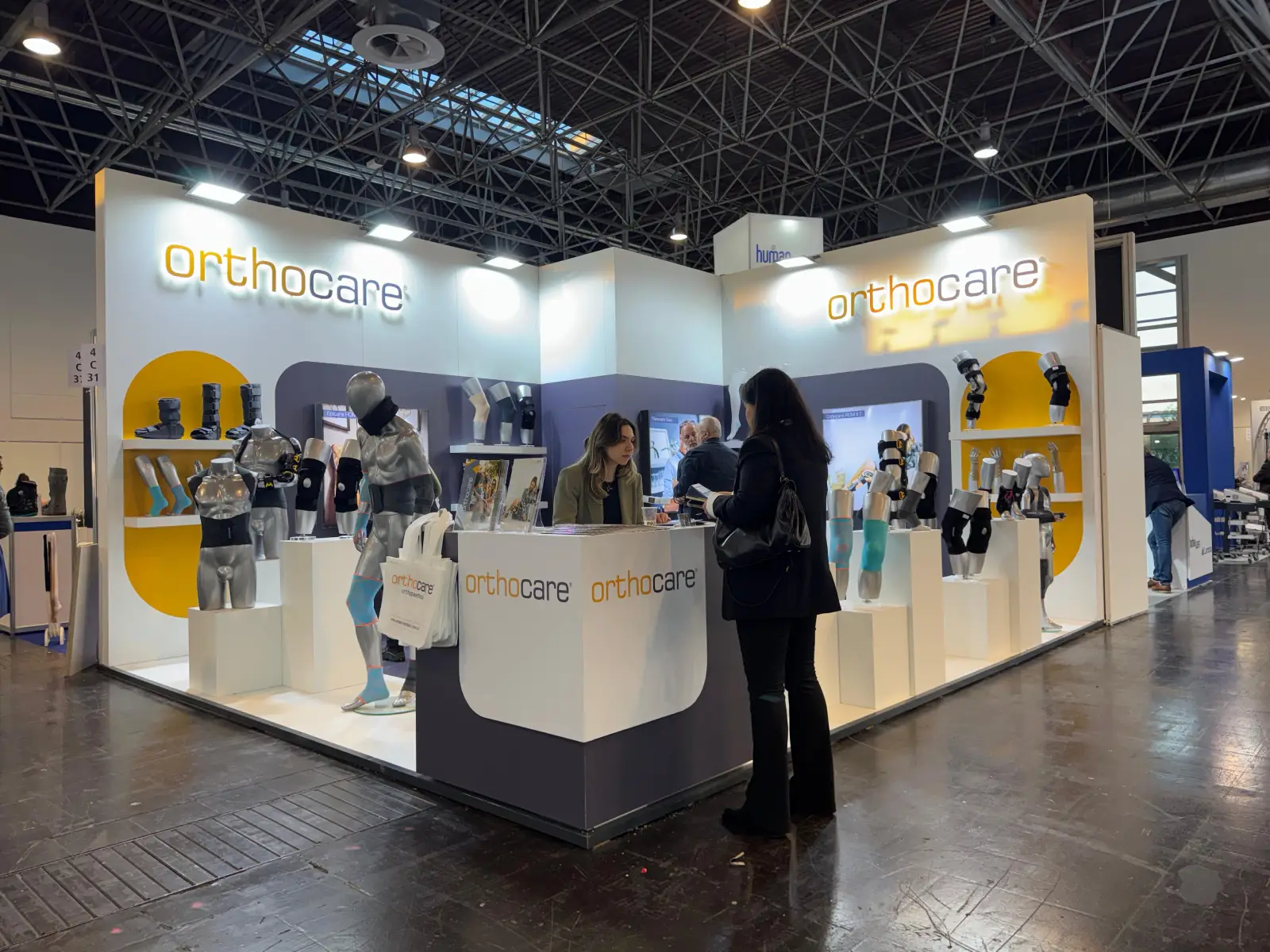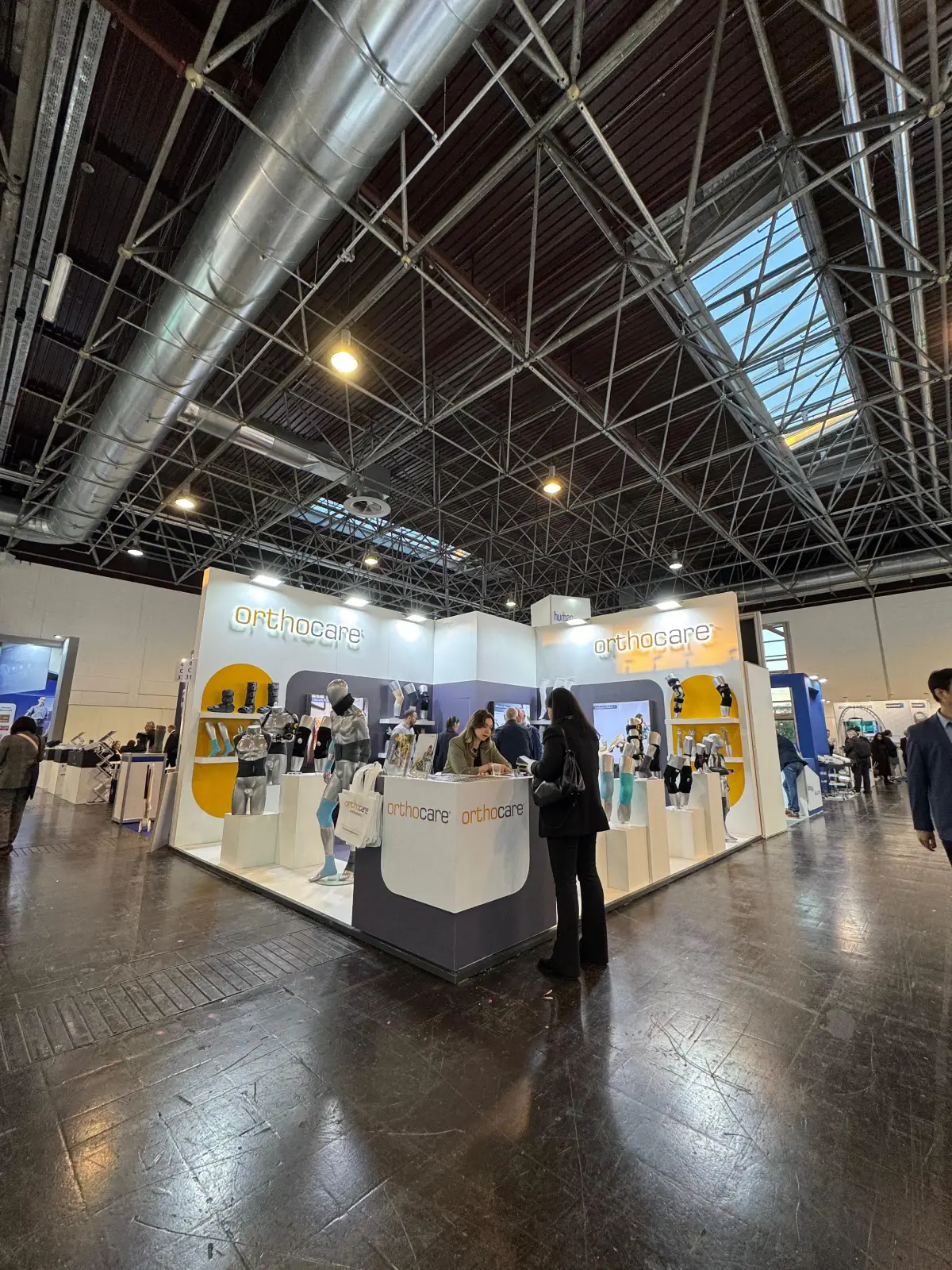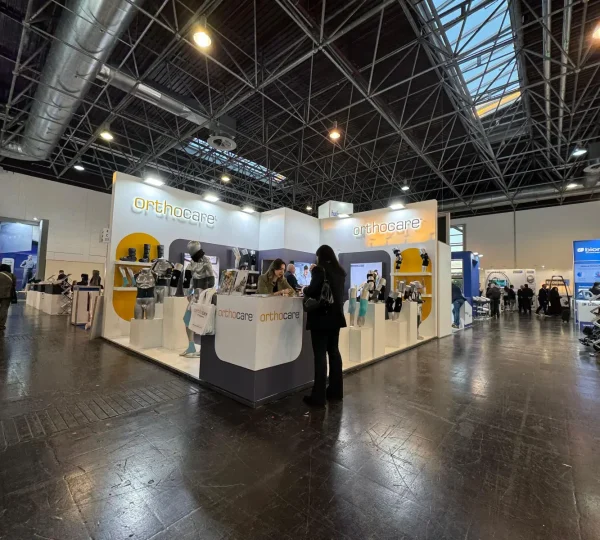 This orthopedic product display stand was developed for Orthocare, focusing on a clean, clinical presentation that supports high-clarity device visibility. The booth layout combines open architectural zoning, direct product-to-visitor sightlines and hygienic display principles commonly required in major healthcare exhibitions.